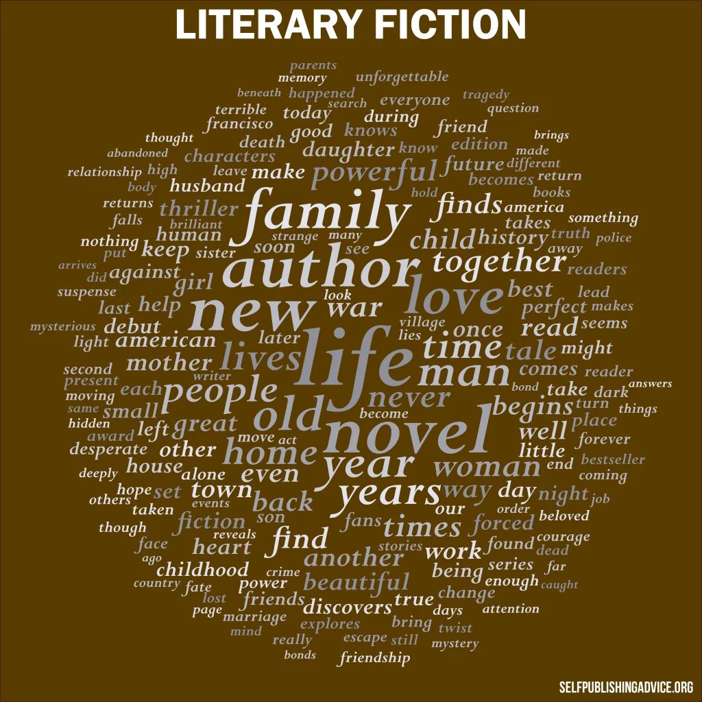 The broad category of Literary Fiction leans much more heavily towards author credentials and critical praise than most categories, likely due to its preponderance of big-name authors across multiple genres. Key terms include NOVEL, AUTHOR, NEW YORK TIMES, ACCLAIMED, GREATEST, WORK OF FICTION, and BEST SELLER.