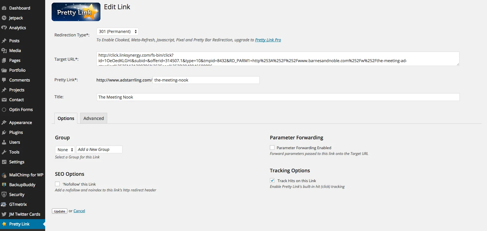 Finally, I also use Pretty Link for the occasional blog post that escapes my local ecosystem. If I find that I need to keep referring to some particularly popular post, I create a Pretty Link for it. A common example is when I provide book excerpts or free short stories on the websites. Using a Pretty Link for that allows me to stick a cleaner link into a Newsletter article featuring the excerpt and to track it independently.