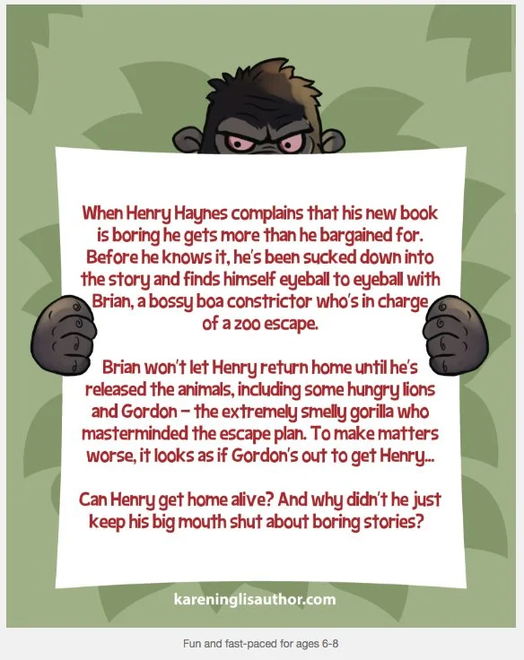 I could hardly contain my excitement when I heard that a gorilla had escaped at London Zoo in early October (and that, thankfully, the situation was “under control”)! Why? Because this presented a wonderful shot-in-the-dark-marketing opportunity for my illustrated children’s chapter book Henry Haynes and the Great Escape in which Gordon, a smelly gorilla, masterminds a zoo escape in which young Henry becomes an unwilling helper.