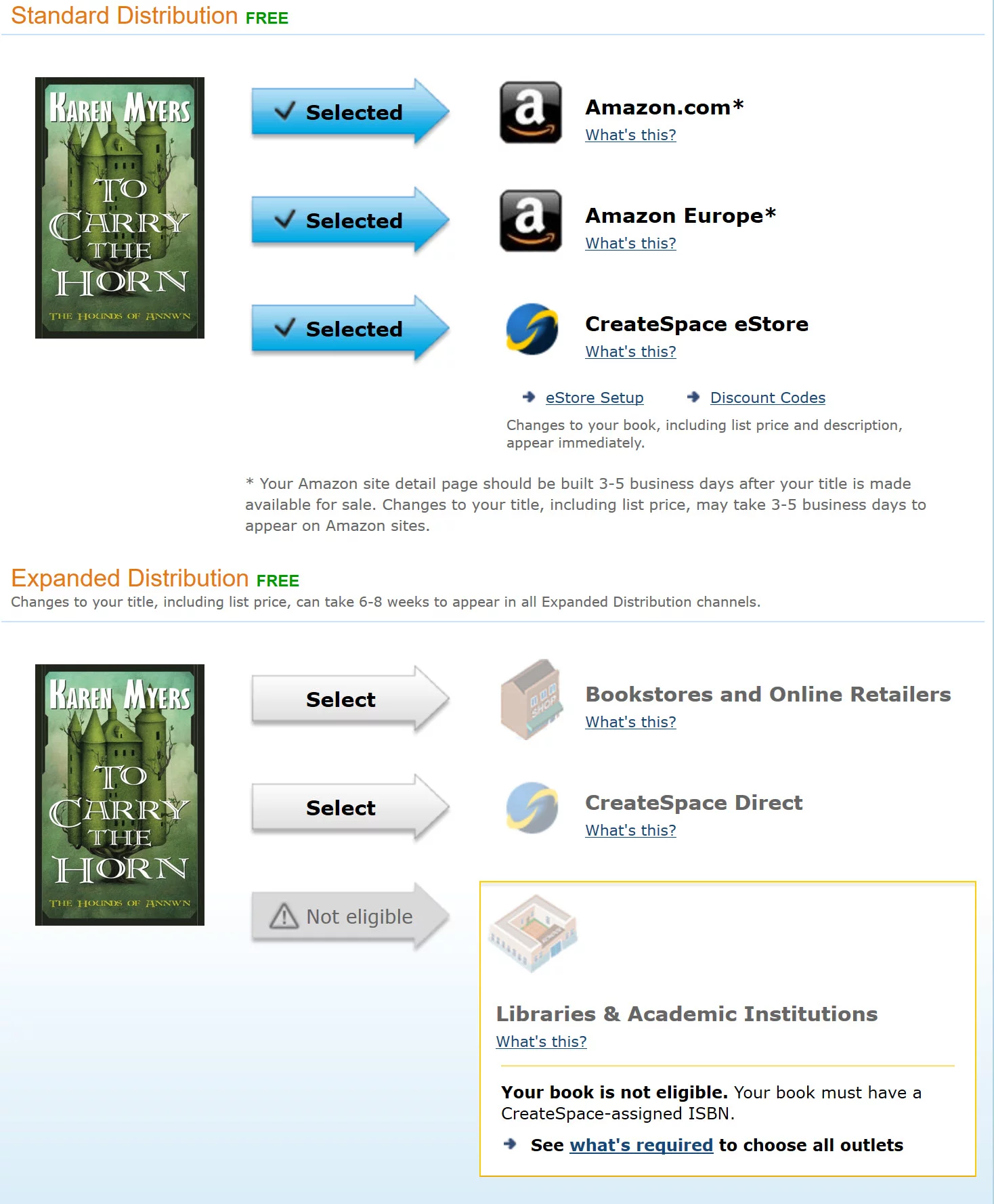 PUBLISHER NAME / ISBN: If we use Createspace’s Expanded Distribution option, the “Booksellers and Online Retailers” part means that Createspace adds our book to their datafeed to Ingram. If we use Createspace’s free ISBN, the official publisher name shows up as “Createspace”; if we use our own ISBN, the publisher name shows up as “OurPressName”.