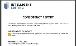 As the name suggests, this is purely for consistency – it does not do the checks mentioned in the tools above, so is a useful addition rather than a replacement. Upload a document; download their report. It will flag up things like inconsistent spelling and hyphenation.