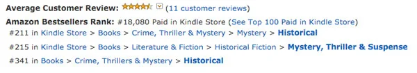 Well, like I said, my UK ranking before I started was in the hundred thousands for The Red Hill, a little lower for Breaker of Bones. After running ads for a month The Red Hill currently stands at position 18,080—just outside the top 200 in Mystery, Crime and Thrillers > Historical > Mystery.