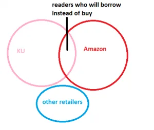 Amazon's exclusive Kindle Unlimited (KU) program (pink) overlaps with the regular Amazon market (red), but mostly being in KU increases your visibility because all sales/borrows are made on the same retailer's site. The other retailers (Barnes & Noble, iBooks, Google Play, Kobo) (blue) are collectively about the same size as the KU market. You can have KU or other retailers but not both.