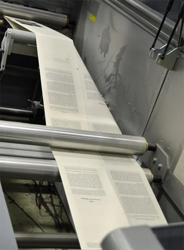 Not, as you might expect, one side then another, like a duplex printer, but up to three or four pages on each side, all printed directly onto a single roll. This is then fed into the folding and cutting section. Out the other end comes a finished book. Just thinking how this actually worked made my head ache!