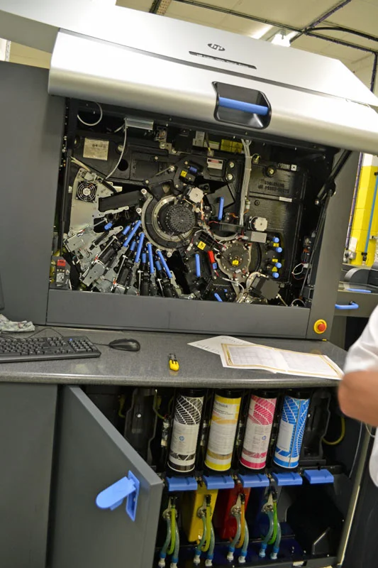 The other production line uses the same technology as ink jet – but here each single ink cartridge costs several hundred pounds! At present the black print from parts of this line is not as dense as the laser equivalent, but Terry told us this was changing, with half the machines already upgraded and the remainder coming online in January next year. These upgraded machines us a really black black. Terry showed us samples of this live, and they are truly exceptional.