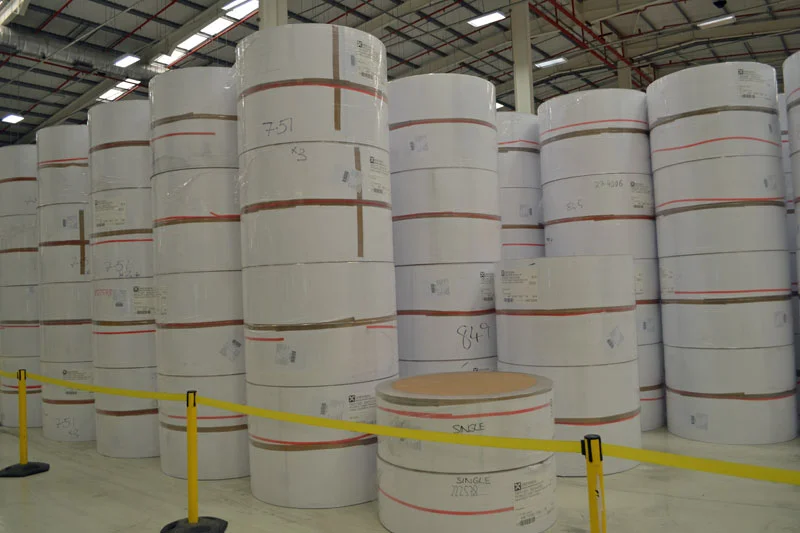 All production lines start with a raw roll of paper which is pre-shaken to stretch it a little from where it has been tightly rolled on the bale. This feeds in to where print is applied.