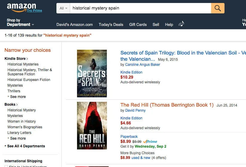 When I type in “historical mystery spain” it returns 167 results in Amazon UK but only 139 results for the .com site. But The Red Hill appears second in the displayed list!