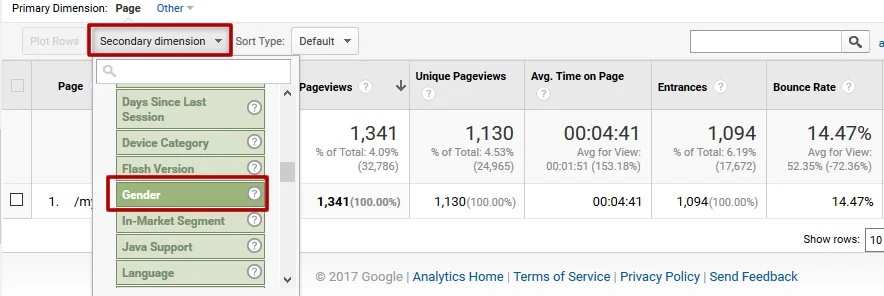 After I had found the “my-room” landing page in Google Analytics, I then clicked on the link to study just the results of that page and then clicked on the Secondary dimension button, scrolled down to Users in the drop down box that came up and selected Gender.