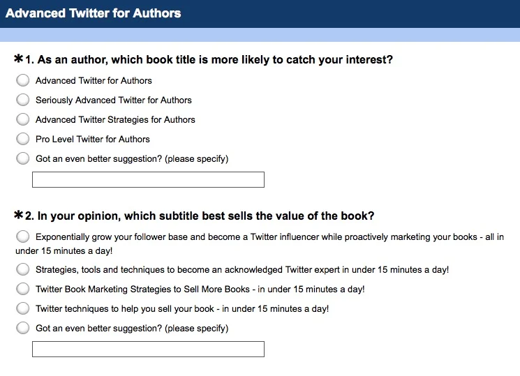 Let me share an example from my own recent experience. I was writing a non-fiction book on using Twitter, aimed other authors. I’d come up with a shortlist of potential high hitting titles and subtitles. I designed a simple questionnaire in SurveyMonkey. The first page gave them the context, explaining why I was looking for their feedback and presented the draft blurb for the book, title omitted. The second page contained two multiple choice questions. Here are the two questions: