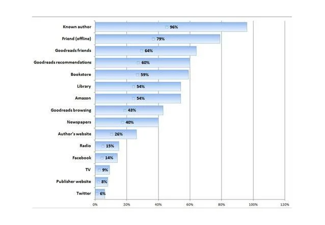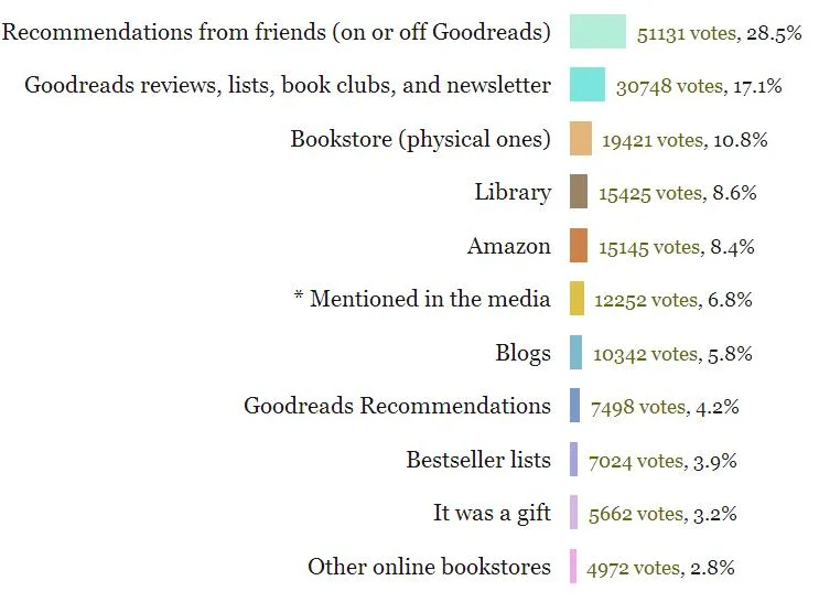 Looking at the figures in more detail, 28.5% – the highest percentage – say they found their last book to read through recommendations from friends. People trust other people’s opinions. So your existing readers are your best sales people, (or not, if you’ve written something below par or outside their taste span).