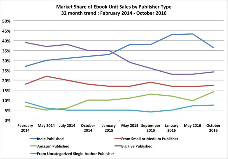 There are some rare instances of graphs that are as famous as works of art. Malthus' J-curve. Climate change's hockey stick. I wonder if this one will join the list. October's Author Earnings report makes strange, potentially grim, reading for indies. The headline figure is simple – by unit sales, value of sales, or earnings, indies have seen, for the first time, a big downtick 9announced the day before The Bookseller published interim survey results showing people thought indie market share of ebooks would continue to grow strongly). There are lots of things to hedge this round with of course, not least of which is that this is just Amazon US. But the growth of Amazon imprints has been noted, and it will make for fascinating trend-watching in the months to come.
