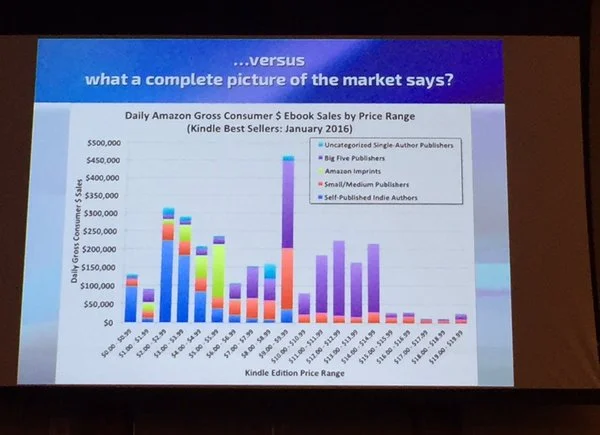 Digital Book World has been taking place in New York this week, and when it comes to self-publishing the silence has been fairly deafening. Author Earnings’ Data Guy proved the exception, and his message on indies was simple and twofold and summed up perfectly in this slide – indies make up a massive hidden segment of the ebook market – and the pricing structure for indie authors looks very different from that of their mainstream-published colleagues (check out this fascinating interview with Data Guy on the Digital Book World website).