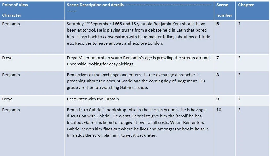 By now, you have a solid story and several story-threads, one for each character. Now expand the one-page plot synopsis of the novel to a four-page synopsis. Basically, you will again be expanding each paragraph from step (4) into a full page. Take that four-page synopsis and make a list of all the scenes that you'll need to turn the story into a novel. Make a list of each scene throughout the whole books and organise them into chapters. Here's how I did it for The Last Seal: